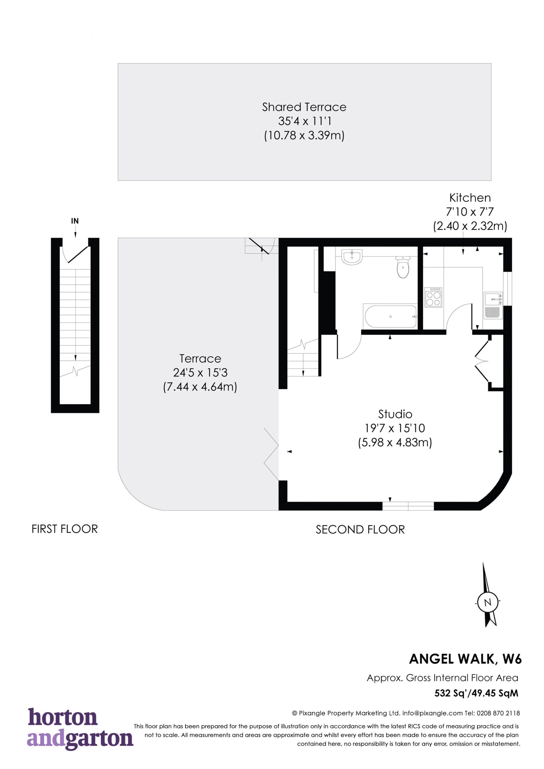 This second-floor studio flat, circa 532 Sq' - 49.45 SqM, featuring a large terrace garden, garage and store room, is centrally located to the transport and recreational amenities of King Street, Riverside and Hammersmith Broadway.