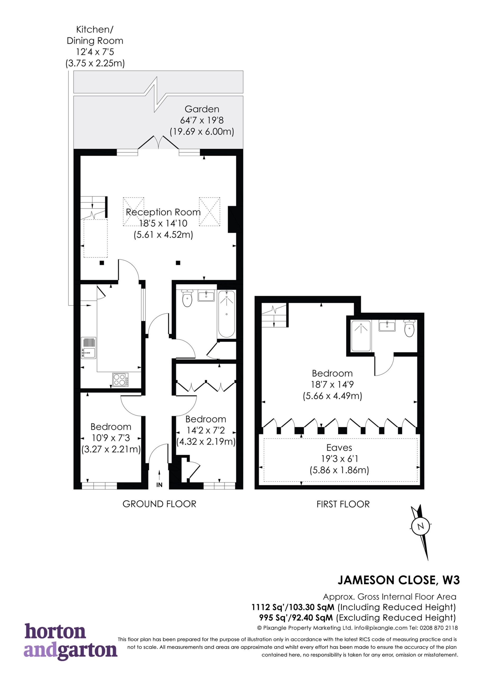 Comprises hallway leading to two bedrooms and bathroom, a 18'5 x 14'10 reception / dining room, separate kitchen and French doors to the outside space. Upstairs is an 18'7 x 14'9 bedroom with ensuite bathroom.