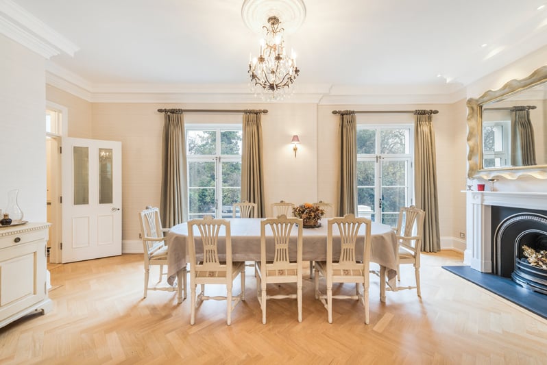 Comprises a raised ground floor entrance hallway, an inviting double reception room with twin aspect front and rear and French door windows opening to ornamental balconies at the front and a South facing terrace to the rear, chevron parquet flooring, two feature fireplaces and motorised ‘dumb waiter’. A home office and guest WC complete the raised ground floor plan.