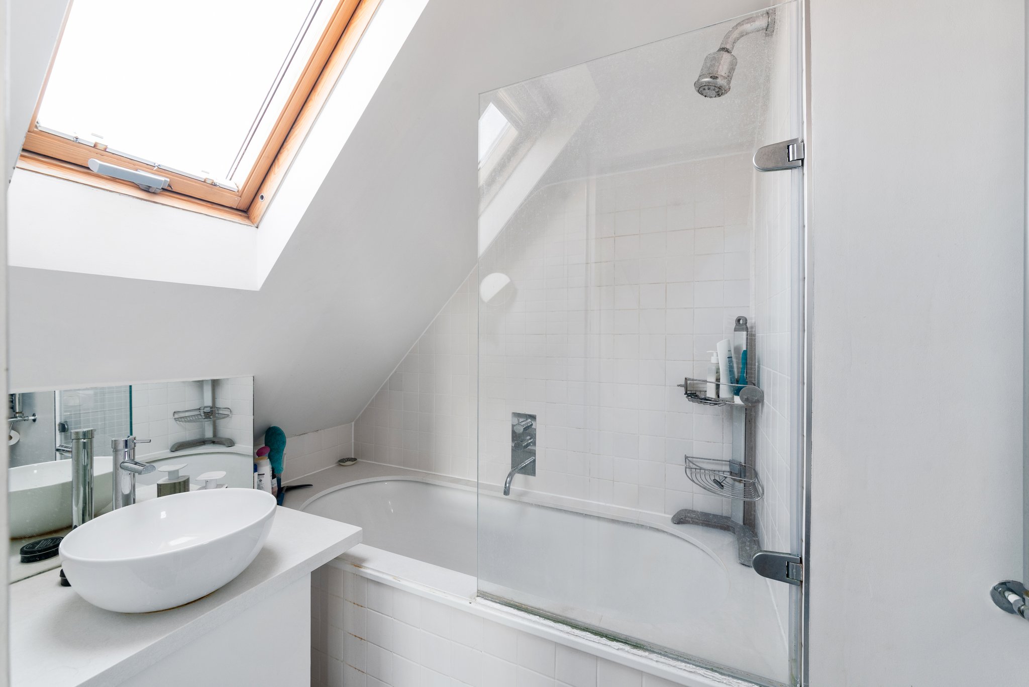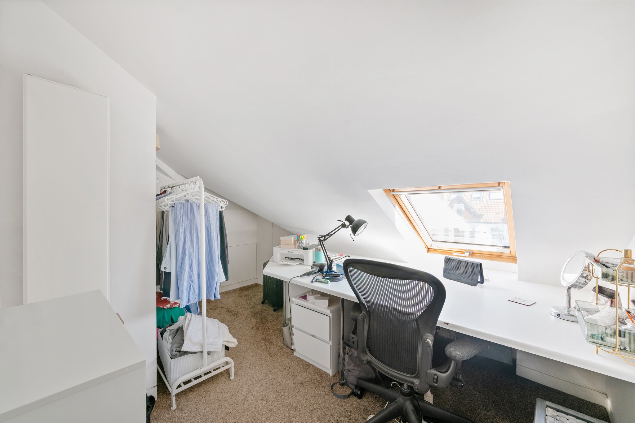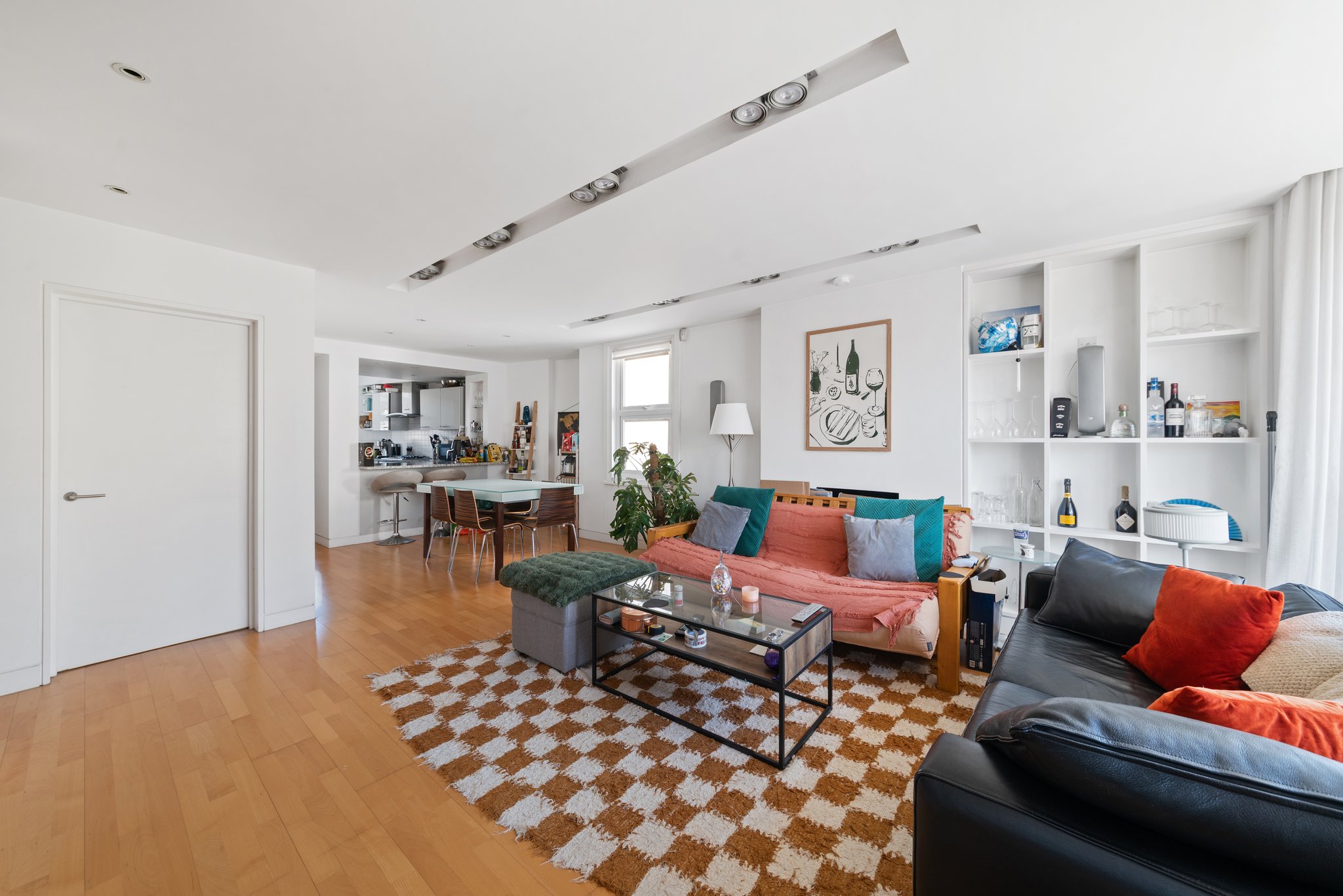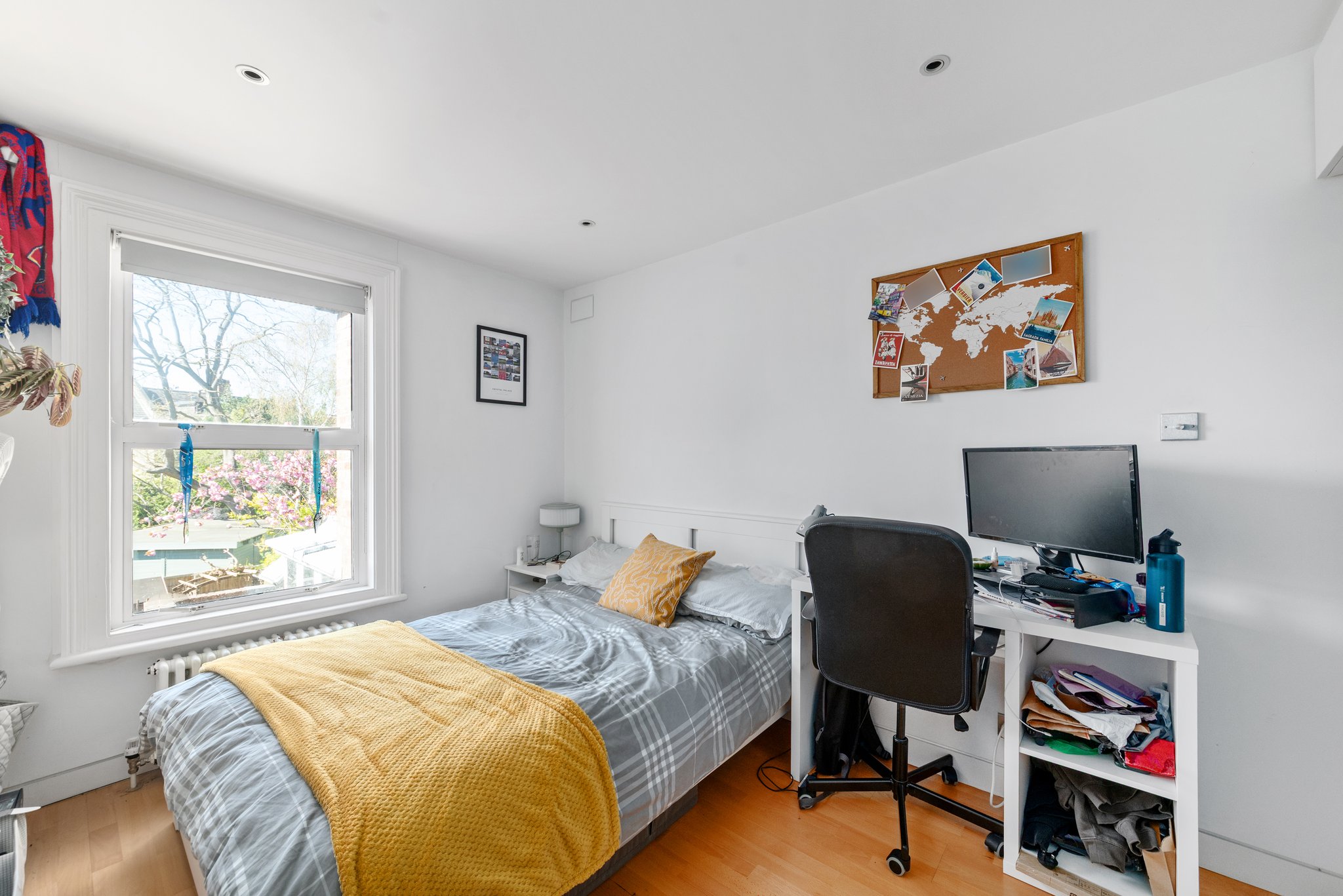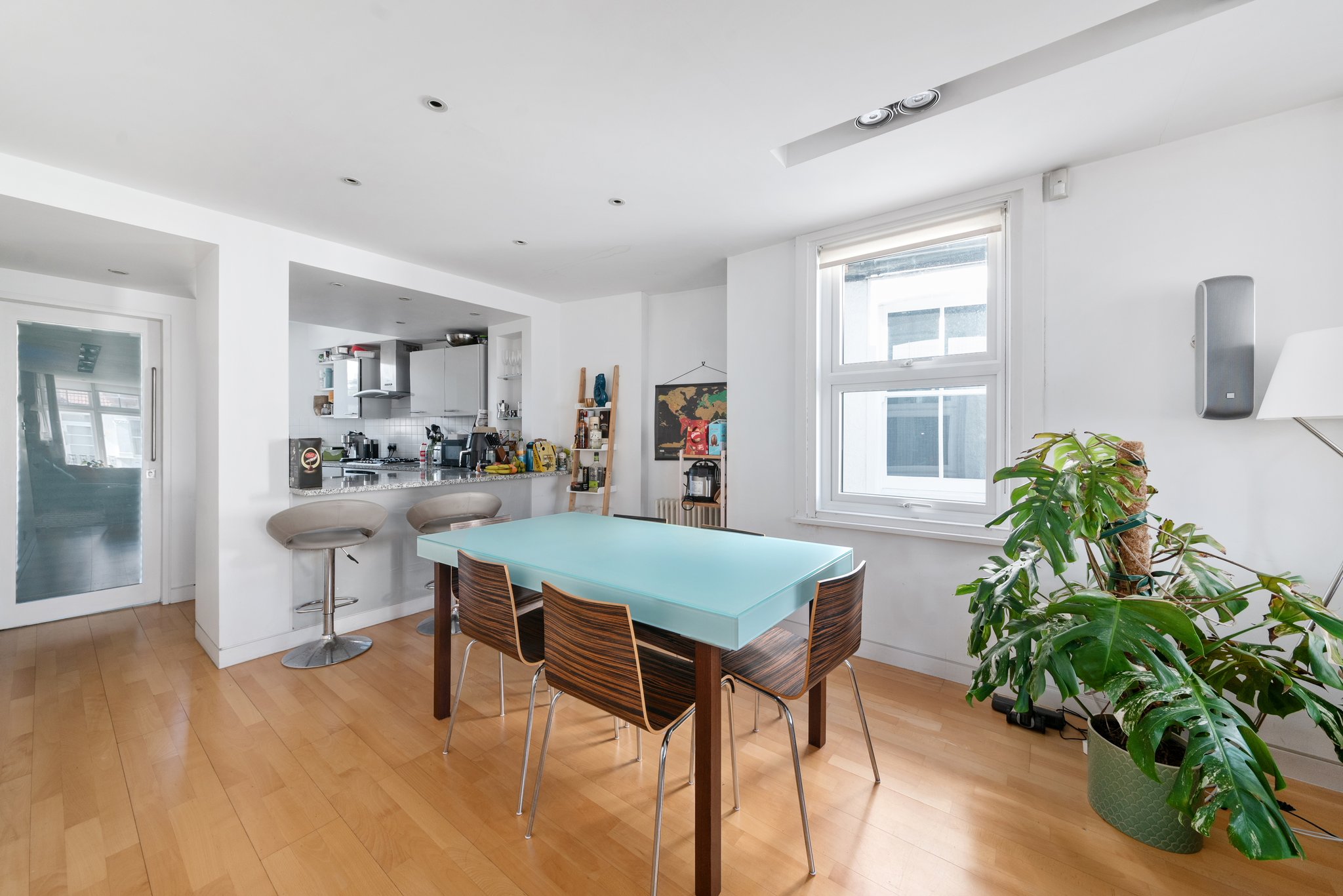 Comprises a ground floor private front door, stairs to a first floor landing, a twin aspect reception room opening to a fitted kitchen, front balcony, bedroom, bathroom and on the upper (second floor) a second bedroom, bathroom and study/office space. No chain.
